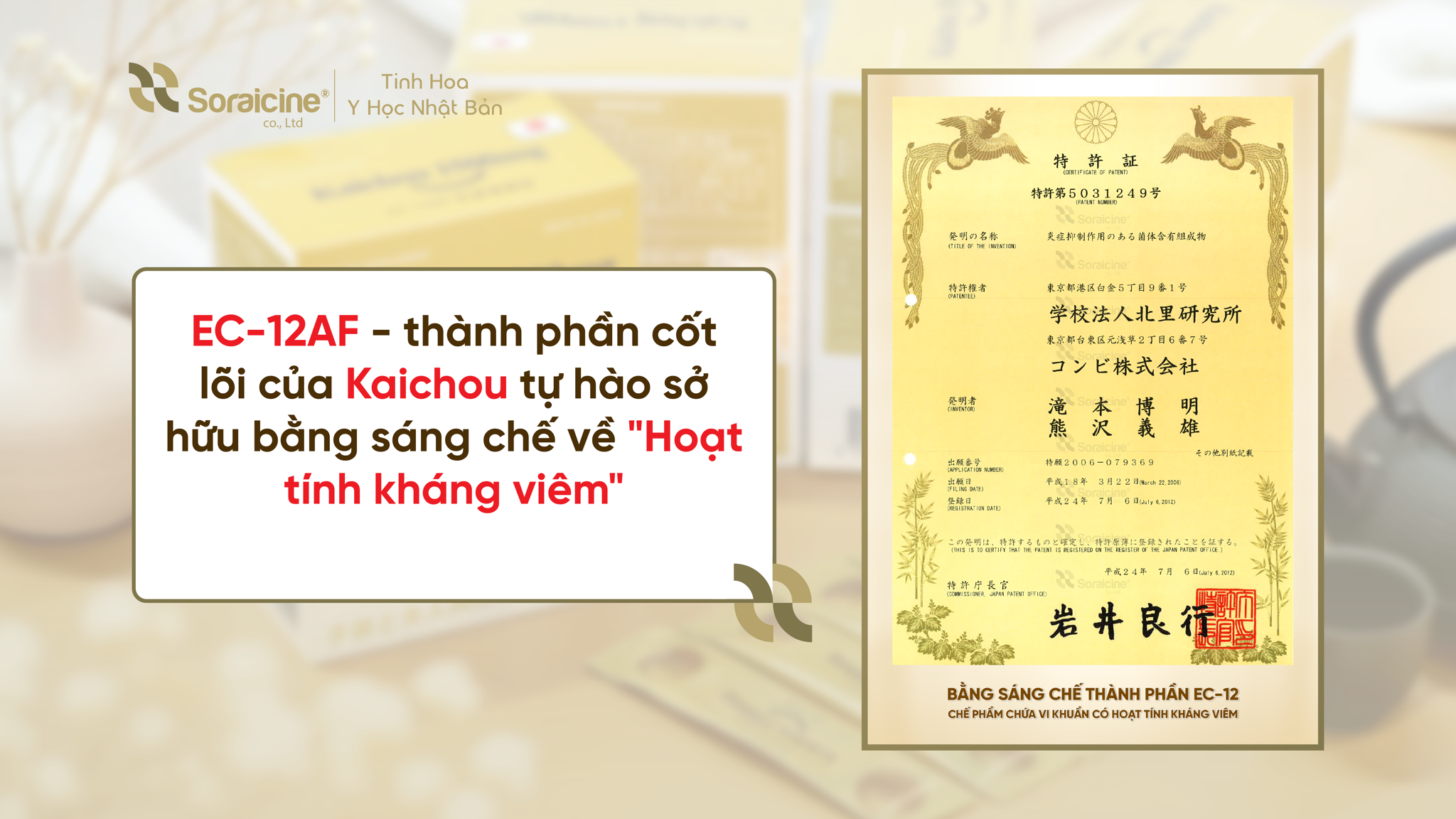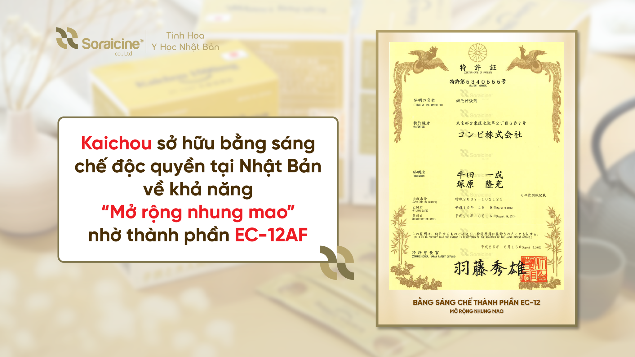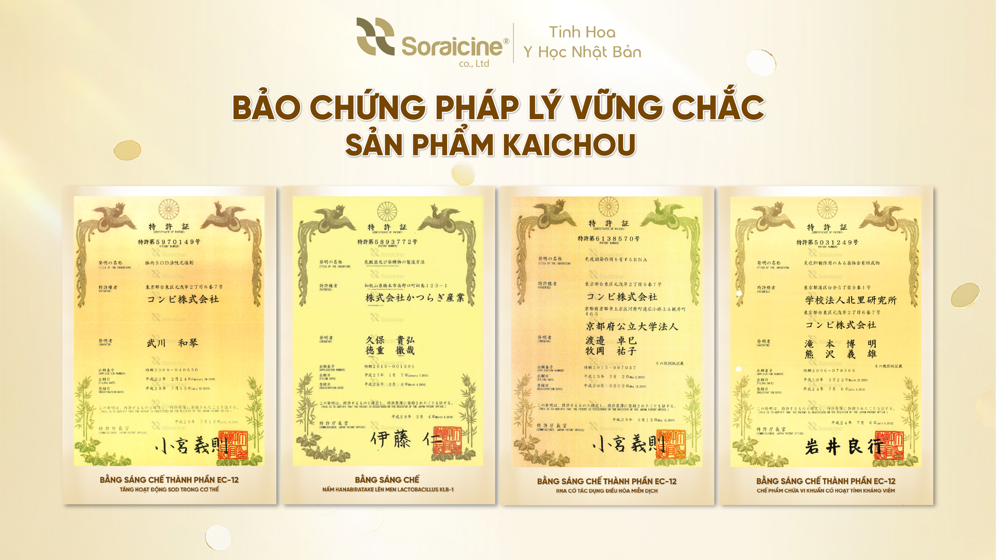 Tất cả các bằng sáng chế của EC-12AF trong Kaichou đều được công bố và đăng ký tại Nhật Bản, đảm bảo minh bạch về nguồn gốc – chứng minh lâm sàng rõ ràng – được cấp phép lưu hành quốc tế.