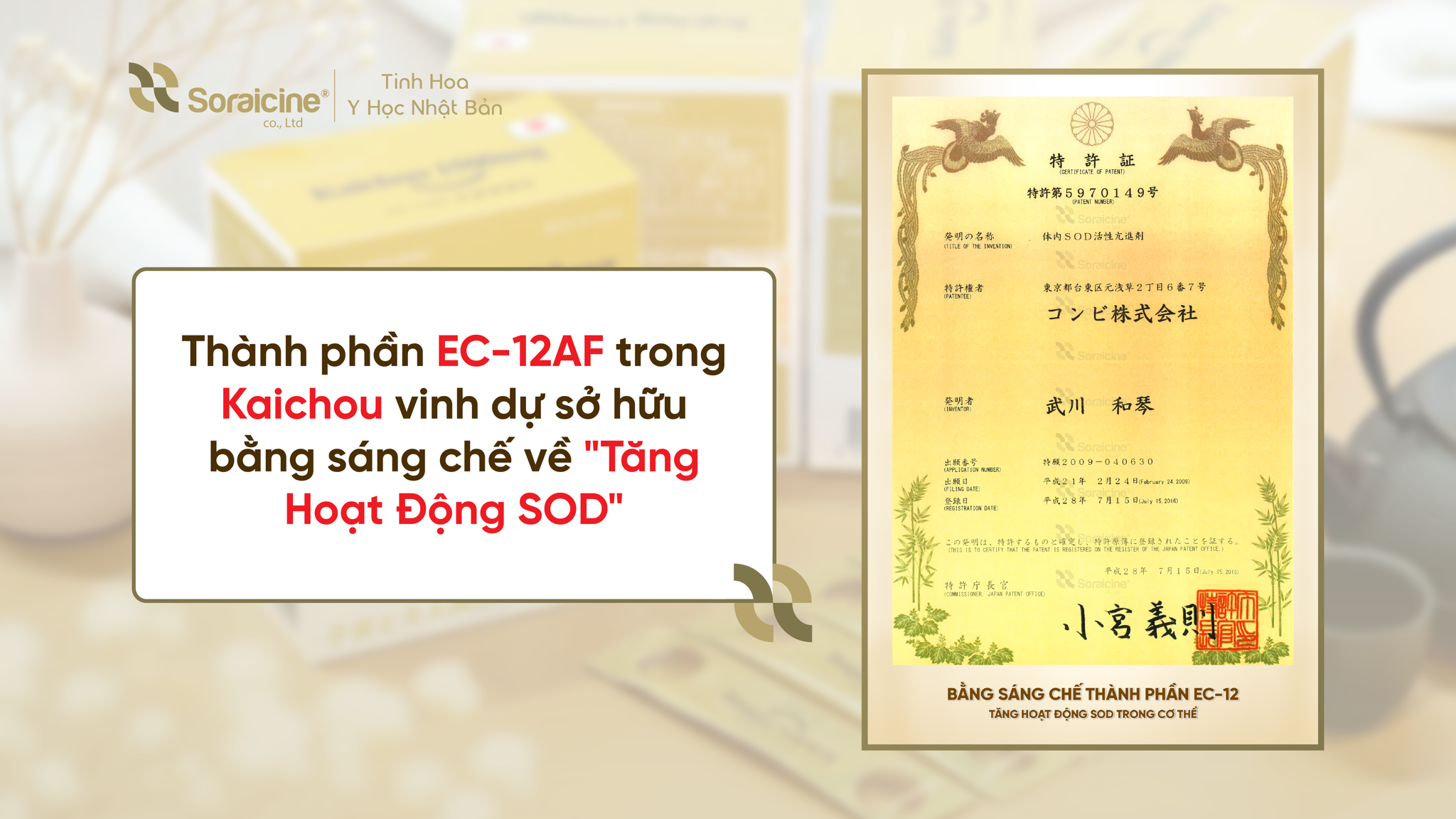 Kaichou với EC-12AF đã được cấp bằng sáng chế về khả năng tăng hoạt động của SOD nội sinh, giúp cơ thể tự sản sinh enzyme này hiệu quả hơn.