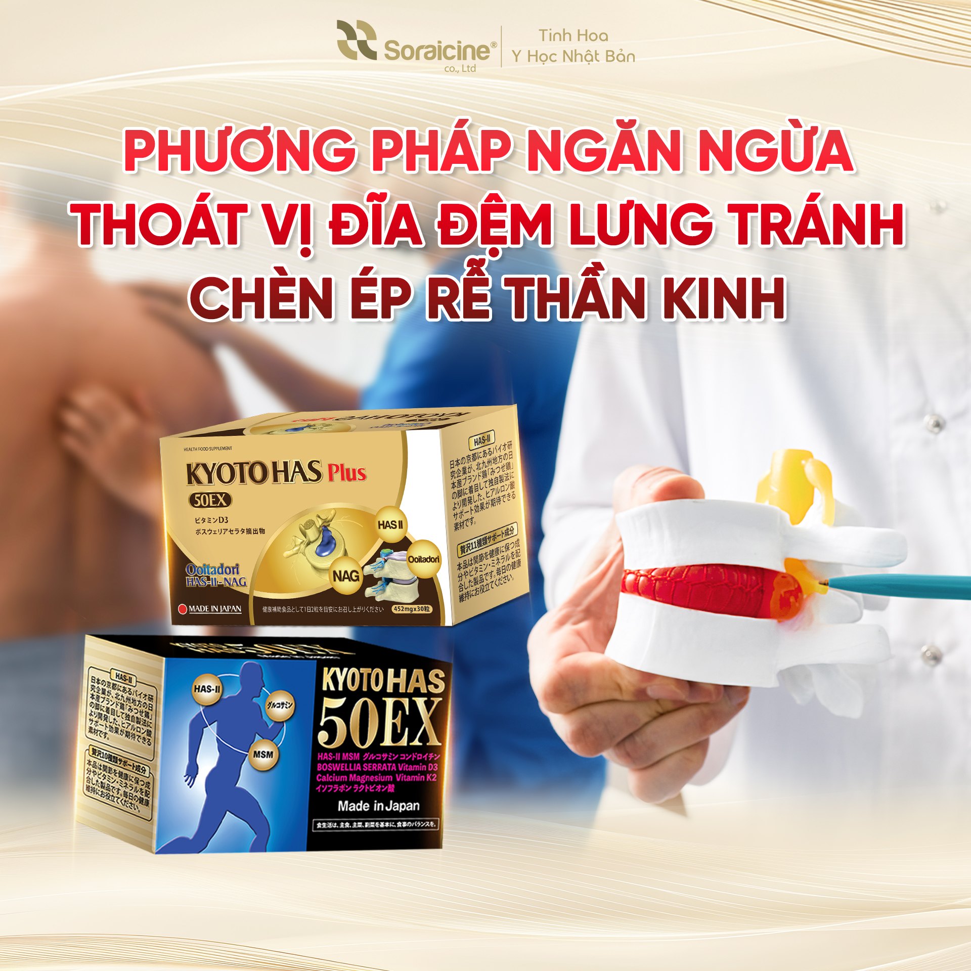 📌 Kyoto Has là giải pháp chuyên biệt giúp ngăn ngừa và hỗ trợ điều trị thoát vị đĩa đệm nhờ cơ chế phục hồi vòng sợi từ gốc. Hoạt chất HAS-II Nhật Bản thúc đẩy cơ thể tự sản sinh Acid Hyaluronic, giúp bôi trơn và tăng độ đàn hồi cho đĩa đệm, giảm áp lực chèn ép rễ thần kinh hiệu quả. Sản phẩm đạt chuẩn GMP, ISO 22000, bảo chứng cho sự an toàn và bền vững.